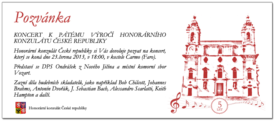 Honorární konzulát České republiky si Vás dovoluje pozvat na koncert, který se koná dne 23.června 2013, v 18:00, v kostele Carmo (Faro).