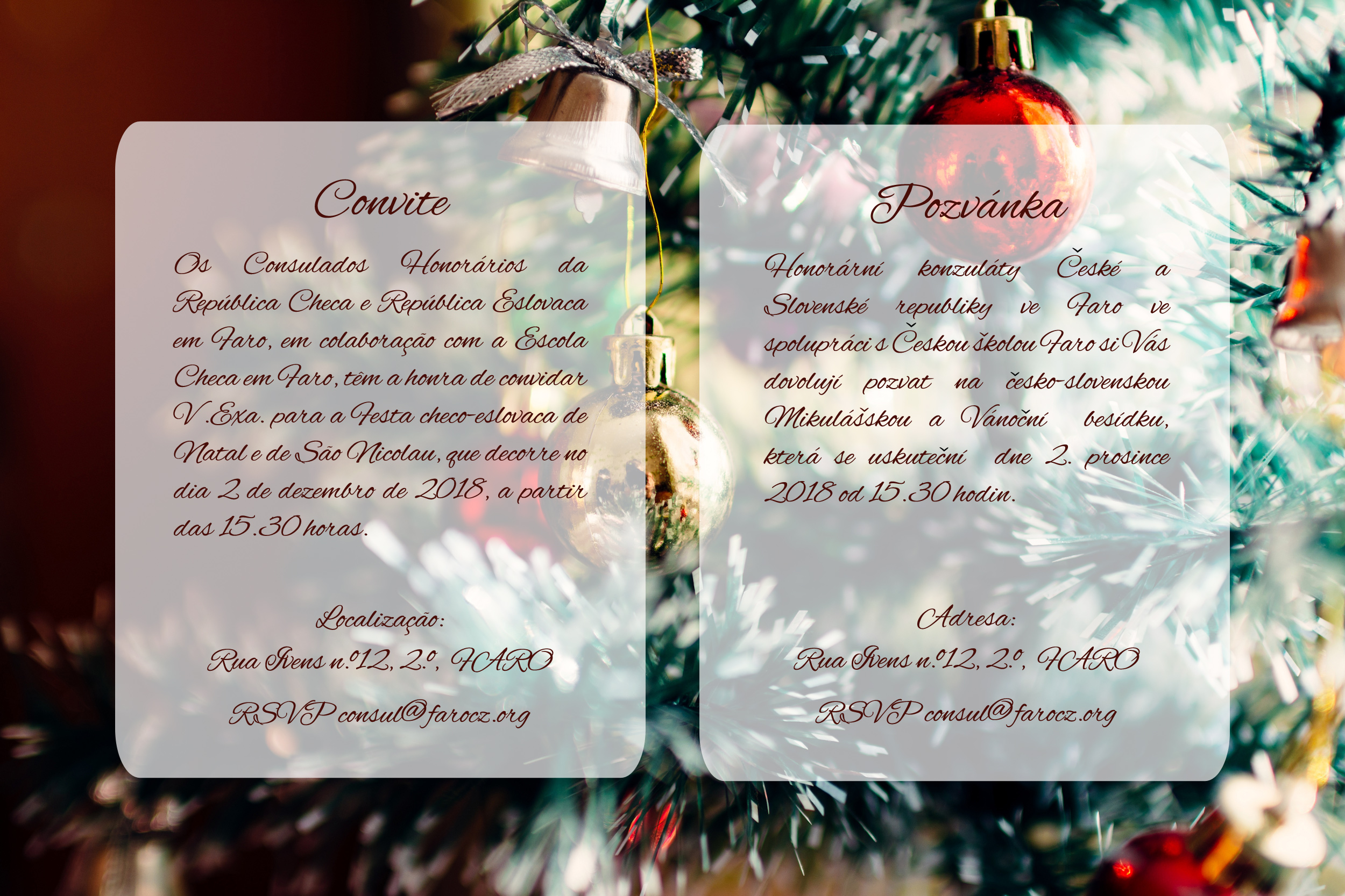 Convite para a Festa de Natal e de São Nicolau 2018Este ano, a Festa de Natal do Consulado Honorário da República Checa em Faro decorre no dia 2 de dezembro, nas instalações do Ginásio Clube de Faro (Rua Ivens n.º 12, 2º), a partir das 15.30 horas. Anterior Seguinte